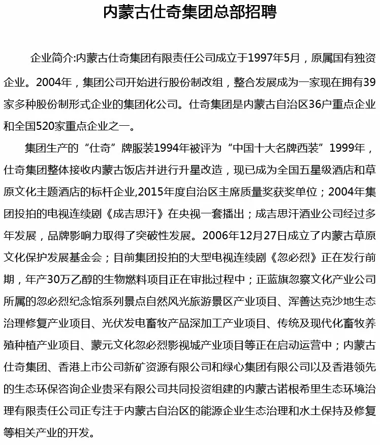 “新时代 新仕奇 新自我”内蒙古仕奇集团各企业职位热招中!