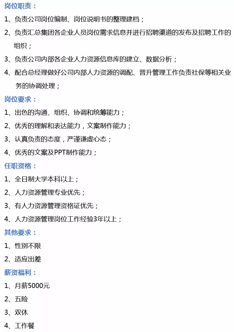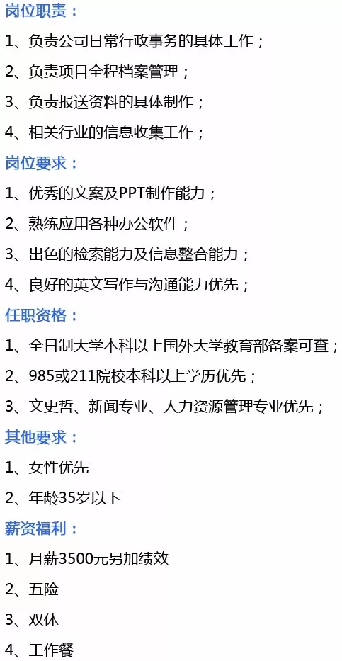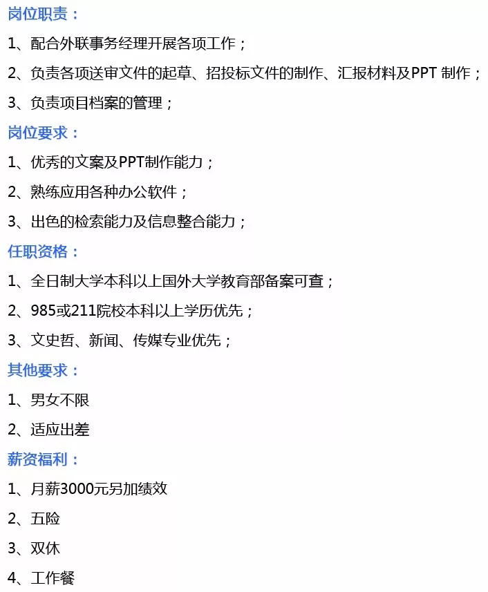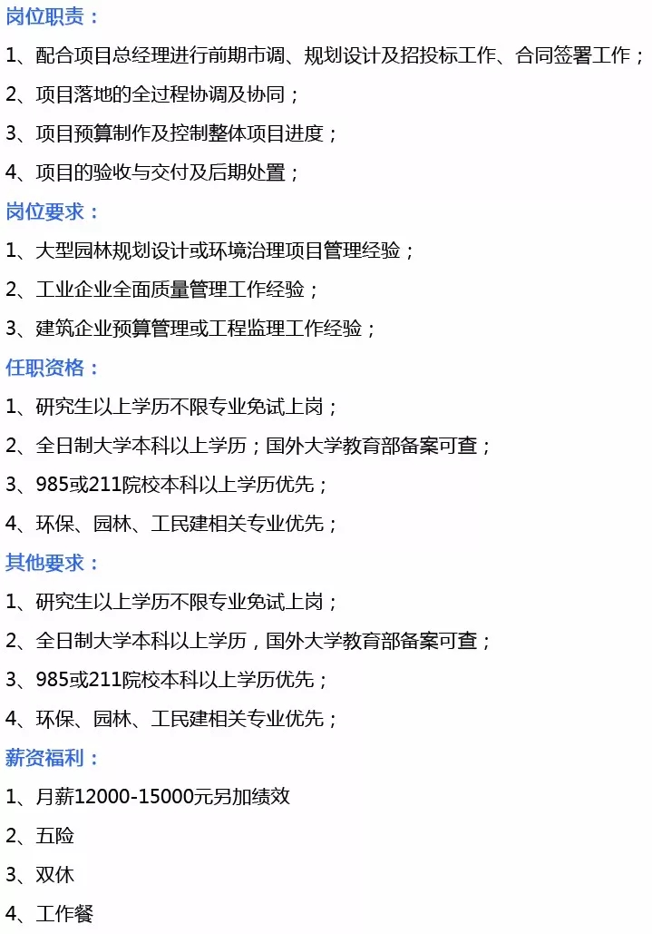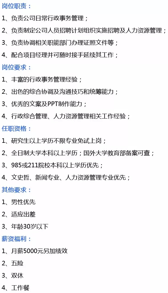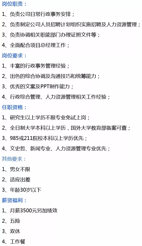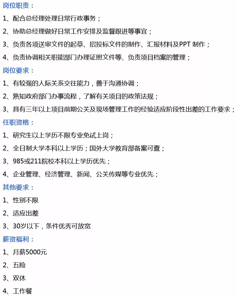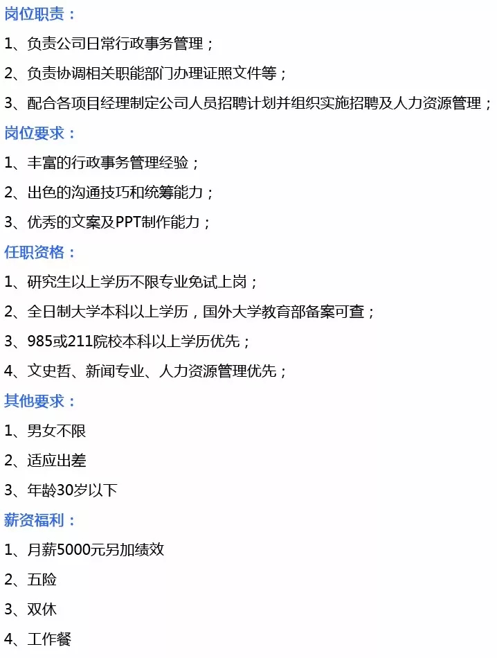 岗位需求:综合管理部经理、综合管理文员、项目执经理