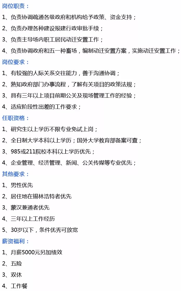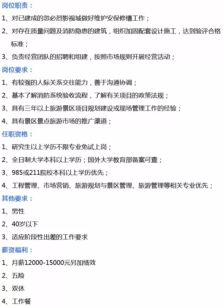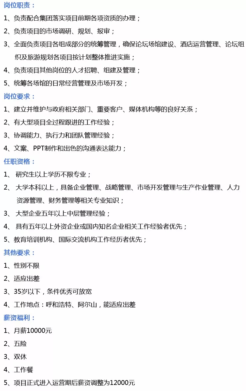 岗位需求:外联事务部经理、外联事务专员、沙地项目统筹经理、影视城项目运营经理、忽必烈纪念馆项目景区建设经理、综合管理部经理、财务部经理