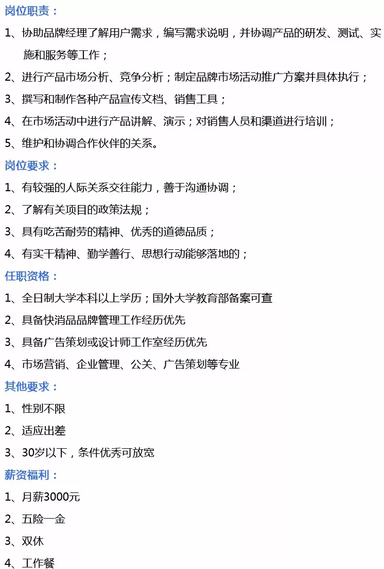 需求岗位:行政专员、项目经理、酒类业务销售经理
