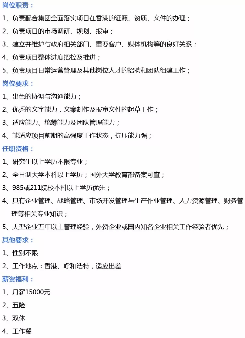 工作地点:呼和浩特市、香港