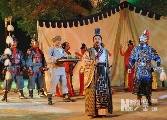 9月29日,演员在内蒙古额济纳旗的胡杨林深处表演音乐情景剧《阿拉腾陶来》。
