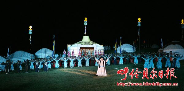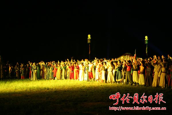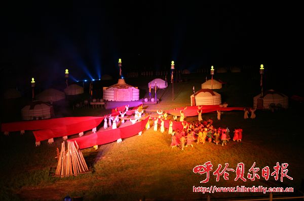 晚8时30分,大型实景演出《呼伦贝尔大草原》正式拉开帷幕。开场音乐如天籁之音从遥远的天穹传来,苍凉悲壮的歌声如泣如诉,仿佛把人们带入天荒地老的古老岁月。整场演出历时60分钟,以星空、月夜为背景,以草原、河水、湿地为舞台,演出分为两幕,第一幕以蒙古族的诞生为主题,浓缩再现一代天骄成吉思汗金戈铁马辉煌的一生。第二幕以草原上升起不落的太阳为主题,着重介绍呼伦贝尔是蒙古民族的摇篮,展现在呼伦贝尔草原上生活的各民族与部落,及现有30多个民族在这里和谐生活,边疆稳定、人民幸福的景象。 演出现场,300余名身着艳丽服装的演员,100多匹战马、百余座蒙古包,营造出气势恢宏的大草原剧场。演出结合呼伦贝尔厚重的草原文化与独特的自然景观,用音乐和舞蹈,形象生动地展示了草原蒙元文化。 据悉,大型实景演出《呼伦贝尔大草原》将持续演出至8月底,每晚演出时间为20:30—21:30。